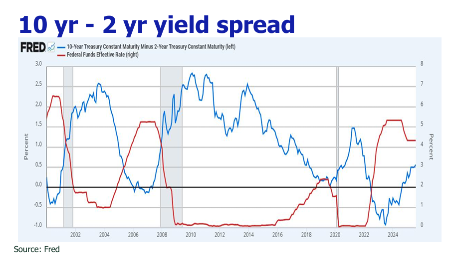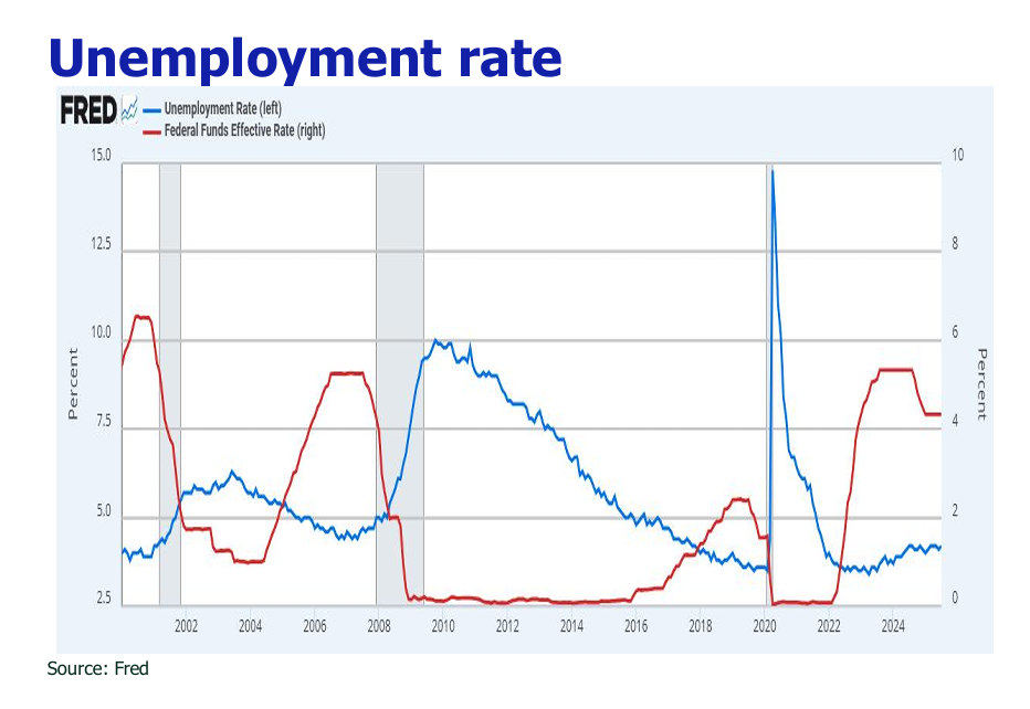 The Federal Reserve initiated its easing cycle with a 25 basis point (bps) cut at its September meeting, setting the federal funds target range at 4.00%-4.25%. Market consensus now strongly anticipates two additional preemptive cuts in October and December (76% probability), versus a lower probability of only one cut (20%).