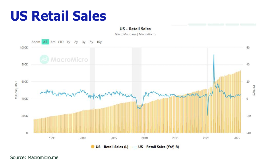 Robust retail sales stay afloat by sustained wage growth and robust equity markets, countervailing headwinds from a softening labor market and tariff-induced inflation.
