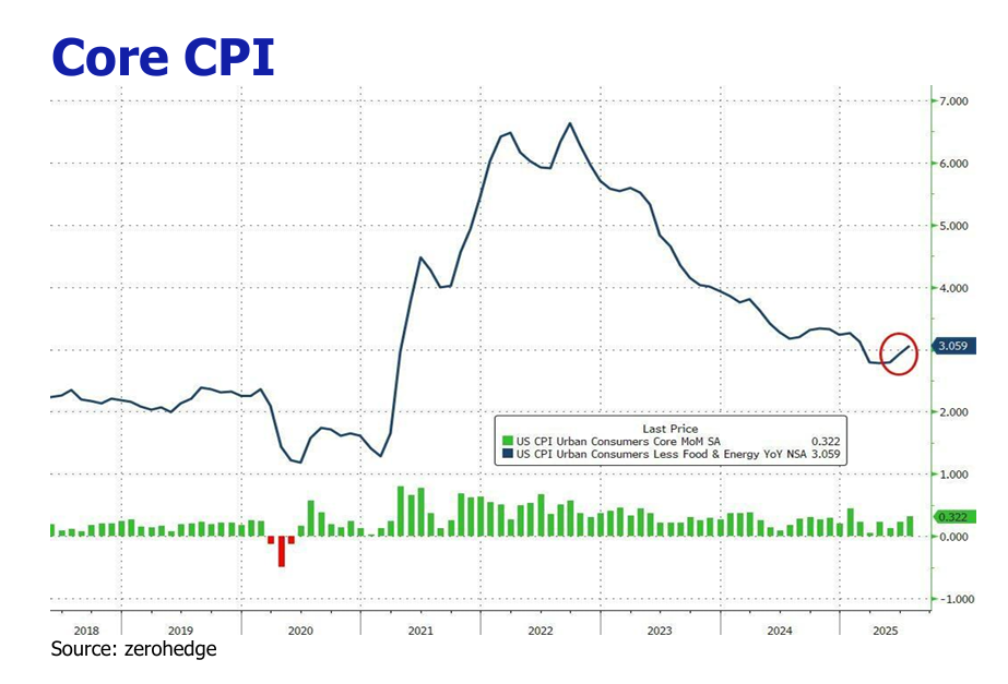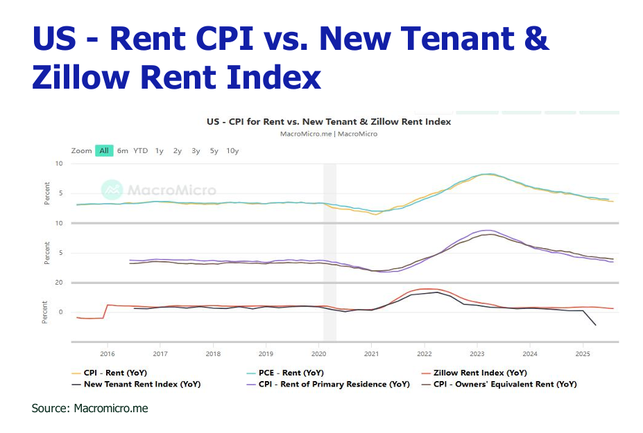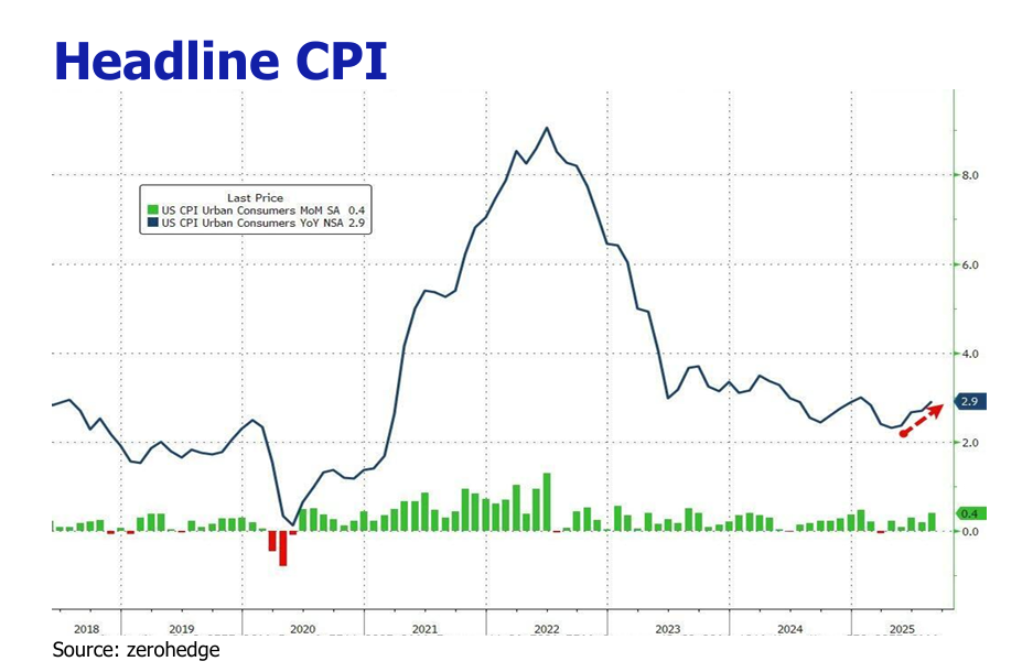 The headline Consumer Price Index (CPI) increased by 2.9% YoY and 0.4% MoM in August 2025, accelerating from July’s 2.7% YoY and 0.2% MoM. The uptick was driven primarily by shelter costs (+0.4% MoM), food prices (+0.5% MoM), and growing passthrough effects from import tariffs. Core CPI, excluding volatile food and energy, rose 0.3% MoM and 3.1% YoY, steady with July. Tariff-driven inflation became more evident in August, with significant price increases in tariff-sensitive categories. Core goods like apparel (+1.1% MoM), electronics (+0.6% MoM), and household furnishings (+0.8% MoM) saw sharp rises, largely due to tariffs on imports from China and Vietnam. Grocery prices jumped, with bananas (+4.9% since April), coffee (+26% YoY), and beef (+14% YoY) reflecting tariffs on Latin American and Asian imports.