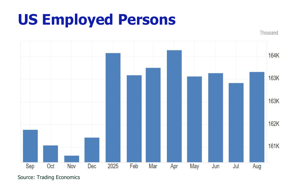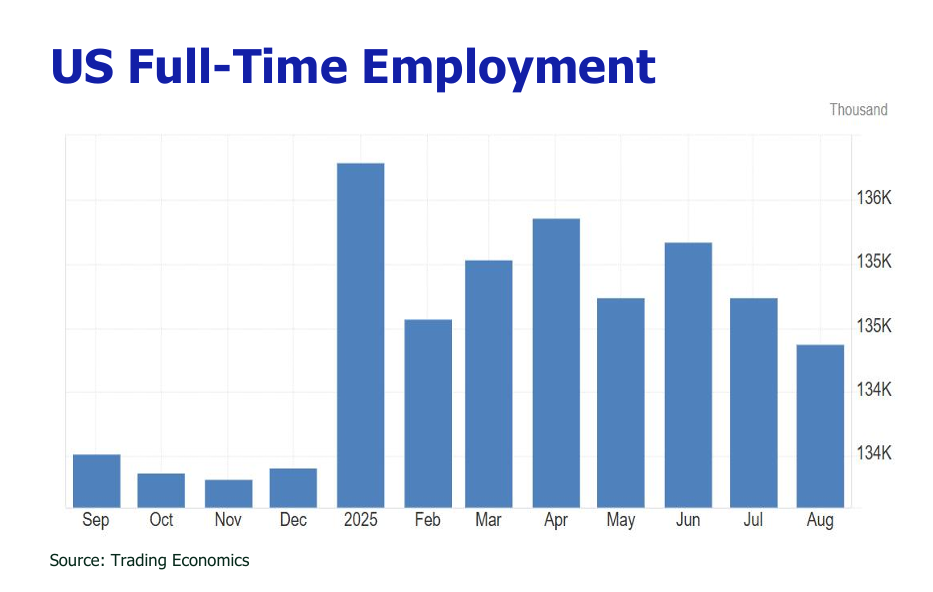 Nonfarm payroll employment grew by a mere 22,000 jobs in August 2025, routing from July’s revised +79,000. The unemployment rate edged up to 4.3% from 4.2%, reaching its highest level since October 2021. Job gains were limited to a few sectors, led by health care (+31,000) and social assistance (+16,000). Most industries, including construction, retail, transportation/warehousing, information, finance, professional/business services, leisure/hospitality, and other services, showed stagnant hiring. Job losses were notable in the federal government (-15,000), manufacturing (-12,000), wholesale trade (-12,000), and mining/energy (-6,000). Preliminary benchmark revisions for April 2024 to March 2025 slashed payroll estimates by 911,000 jobs, or roughly-76,000 per month. Combined with August’s revisions, the average monthly job growth over the past three months was a paltry 29,000. Nonfarm payrolls have now grwn by less than 100,000 for four consecutive months, the weakest streak since the pandemic. Full-time employment plummeted by 357,000 in August, the second straight month of significant declines. Meanwhile, part-time jobs surged by 597,000, the largest increase since February 2025, highlighting a shift toward less stable employment.