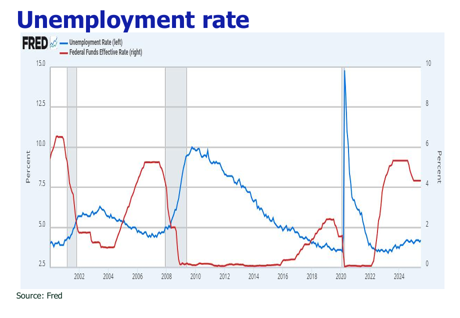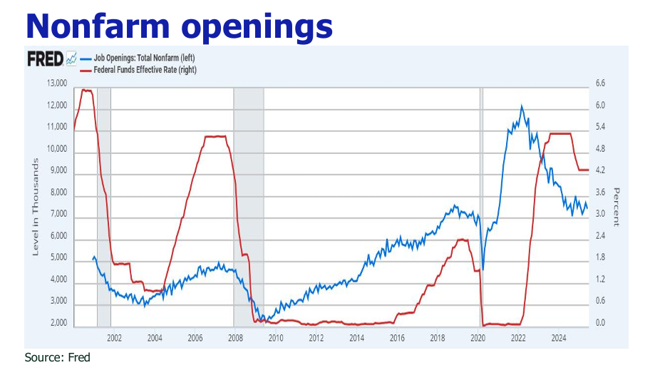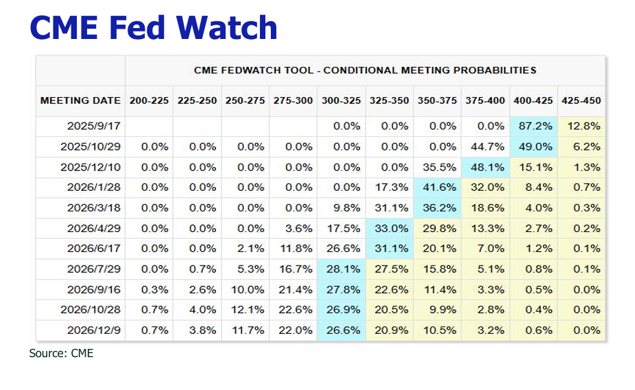 In light of these combined factors—weakening energy inflation, delayed tariffs, and a cooling labor market—we anticipate a Federal Reserve rate cut at the September FOMC meeting. This aligns with market pricing, which, according to the CME FedWatch Tool, currently implies an 87% probability of a 25 basis point reduction from the current 4.25%-4.50% target range.