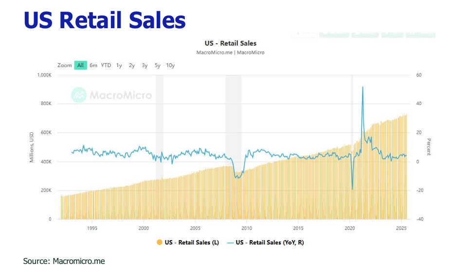 July’s retail scene sparkled with a +0.5% MoM rise, buoyed by strong auto sales linked to expiring credits and robust discount-driven online shopping.