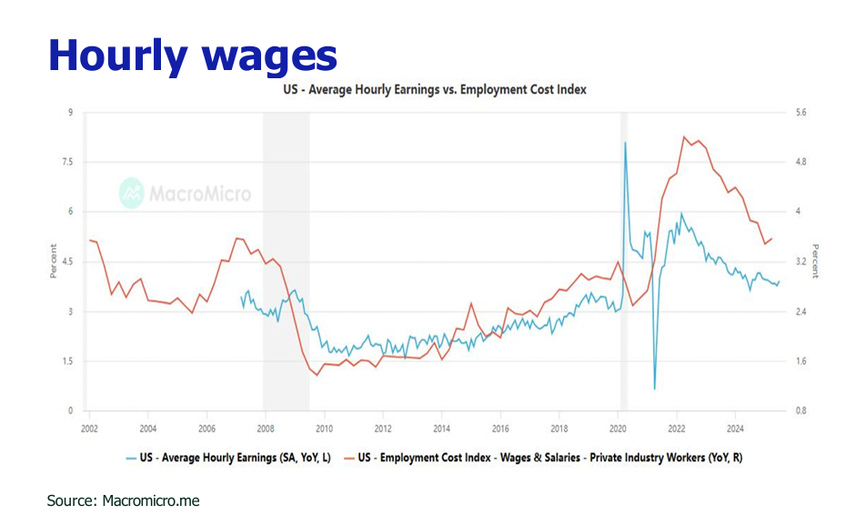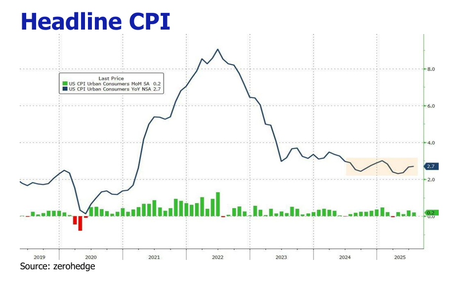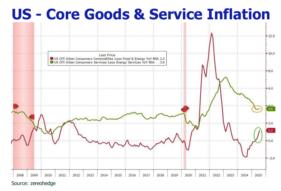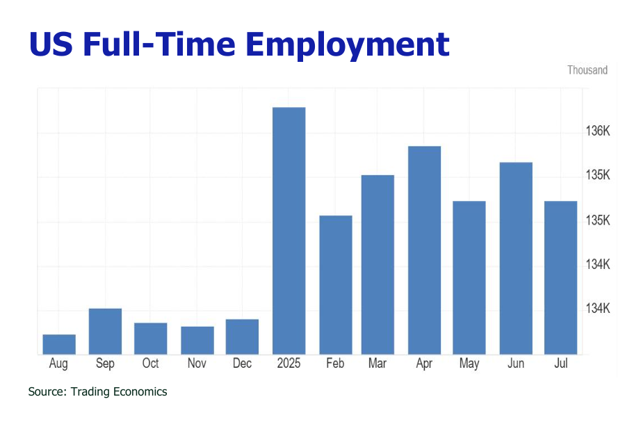 trajectory of CPI is poised to intensify as the temporary factors that muted the initial inflationary impact of tariffs begin to fade. While foreign producers have thus far absorbed a significant portion of the cost—keeping import price rises lower than expected—this dynamic is unsustainable as their profit margins shrink. Furthermore, the extensive stockpiling of goods by companies ahead of tariff implementation dates (such as in February and March 2025) created a buffer that delayed the full pass through to consumers; as these inventories now deplete, we project a stronger CPI surge in August and September, with firms projected to pass on a greater share of costs—Goldman Sachs estimates this will rise to 70%, up from the current 50/50 split with consumers. However, this building inflationary pressure, which challenges the Fed’s 2% target, will be tempered by a weakening labor market, evidenced by a meager 73,000 jobs added in July, cautious consumer spending, which may ultimately limit businesses’ ability to fully pass on all further costs amidst a slowing economy.