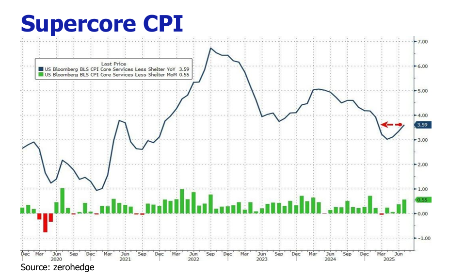 In July, US inflation data showed headline CPI rising 0.2% MoM (June: 0.3%) and 2.7% YoY, (unchanged from June), driven by a-1.1% MoM energy drop despite stable food prices and persistent shelter cost increases (+0.2% MoM, +3.7% YoY). Core CPI accelerated to +0.3% MoM (June: 0.2% MoM) and +3.1% YoY (June: 2.9% YoY), the highest since February 2025, fueled by shelter and rising core goods (+0.2% MoM; used cars +0.5%). Supercore CPI (core services ex. shelter) jumped +0.5% MoM and +3.7% YoY, led by transportation (+0.8%) and medical care (+0.7%). The inflationary pressure from tariffs persisted, albeit at a weaker pace than forecast in several sectors. Household furnishings and supplies, rose +0.7% MoM in July (after +1.0% in June), reflecting the impact of new tariffs on steel, aluminum, and consumer goods from China and other trading partners. Coffee prices surged +2.3% MoM (+14.5% YoY), driven by a 50% tariff on Brazilian imports effective August 7. Apparel and core commodities prices increased modestly by +0.1% MoM and +0.2% MoM respectively, while canned fruits and vegetables, typically import-heavy, remained flat.