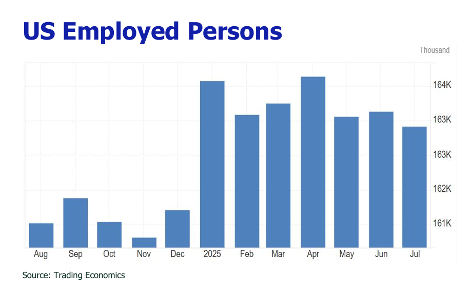 US Non-Farm Payrolls rose by a mere 73,000 in July, following sharply revised-down figures for May (125,000 to 19,000) and June (-133,000 to 14,000) and a far cry from the 105,000 expected, reflecting a slowing labor market driven by trade policy uncertainties, immigration restrictions, and federal efficiency cuts. The unemployment rate edged up to 4.2%, with the labor force participation rate dipping to 62.2%, the lowest since November 2022, as 38,000 left the labor force and long-term unemployment rose to 1.8 million. Job gains were concentrated in health care (+55,000) and social assistance (+18,000), while federal government jobs fell by 12,000, part of an 84,000 decline since January due to restructuring efforts. Manufacturing and professional services saw losses, exacerbated by high tariffs disrupting supply chains.